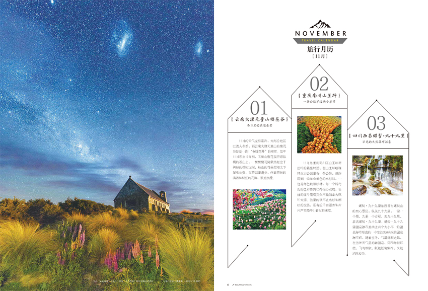 除了内容丰富,杂志的排版和图片也非常精美。杂志中的照片展示了各种美丽的景色和风景,通过色彩鲜艳、清晰动人的图片,读者能够更加直观地感受到旅行的魅力。精心设计的排版和插图使整本杂志更加有吸引力和易读性。杂志作为一本以旅游为主题的综合性杂志,致力于提供全面、准确、有趣的旅游资讯和信息。通过景点介绍、旅行攻略、文化交流等内容,杂志为读者规划和享受旅程提供了重要的参考和帮助。精美的排版和图片使杂志更加吸引人,向读者展示了旅行的美丽和多样性。
